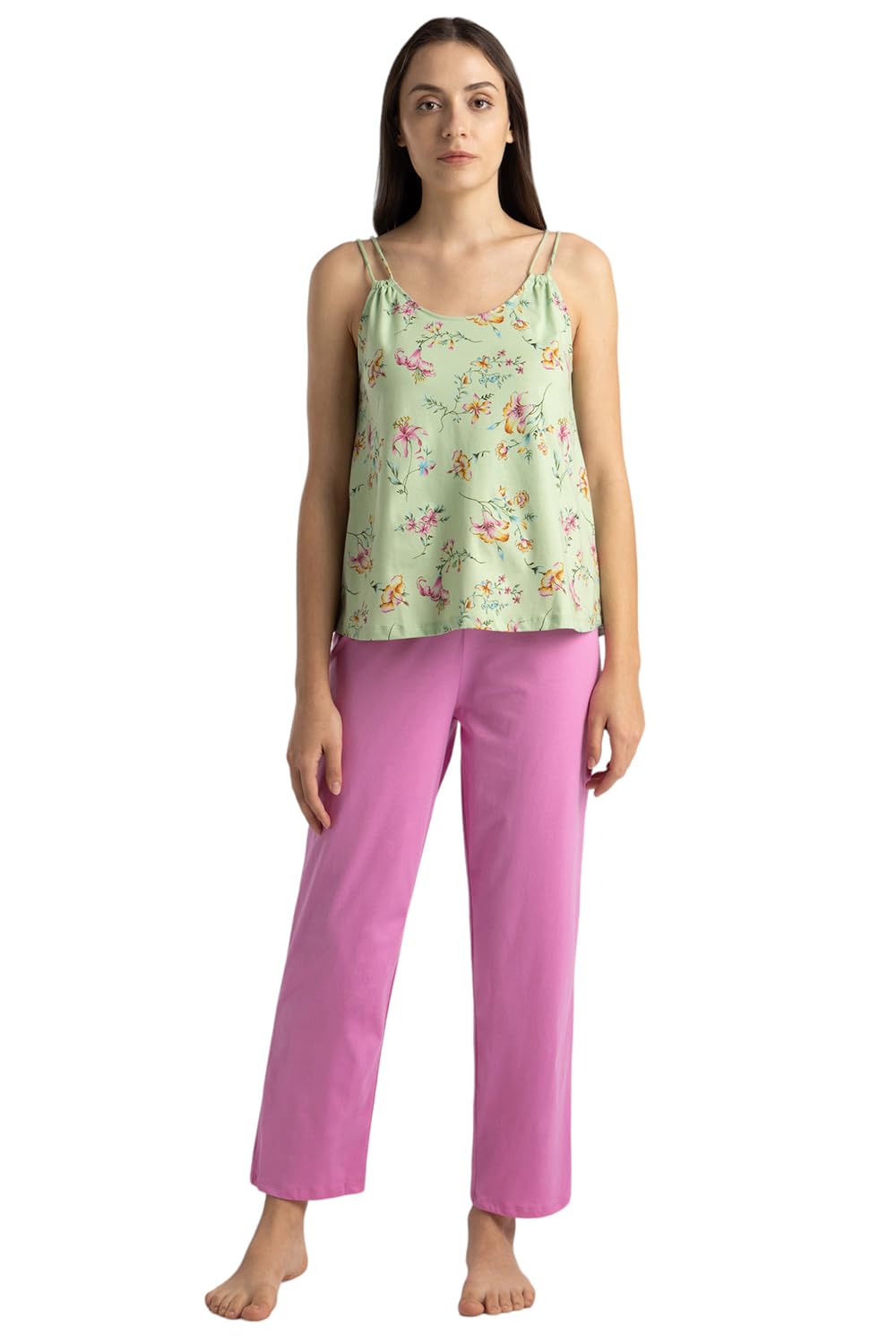 This no-fuss set is sure to take you from sleep to lounging with ease. Look lovely in this 100% cotton cami top and pants set. This bundle comes with a printed sleeveless top and ankle-length bottoms.