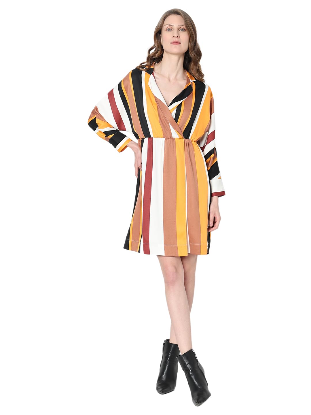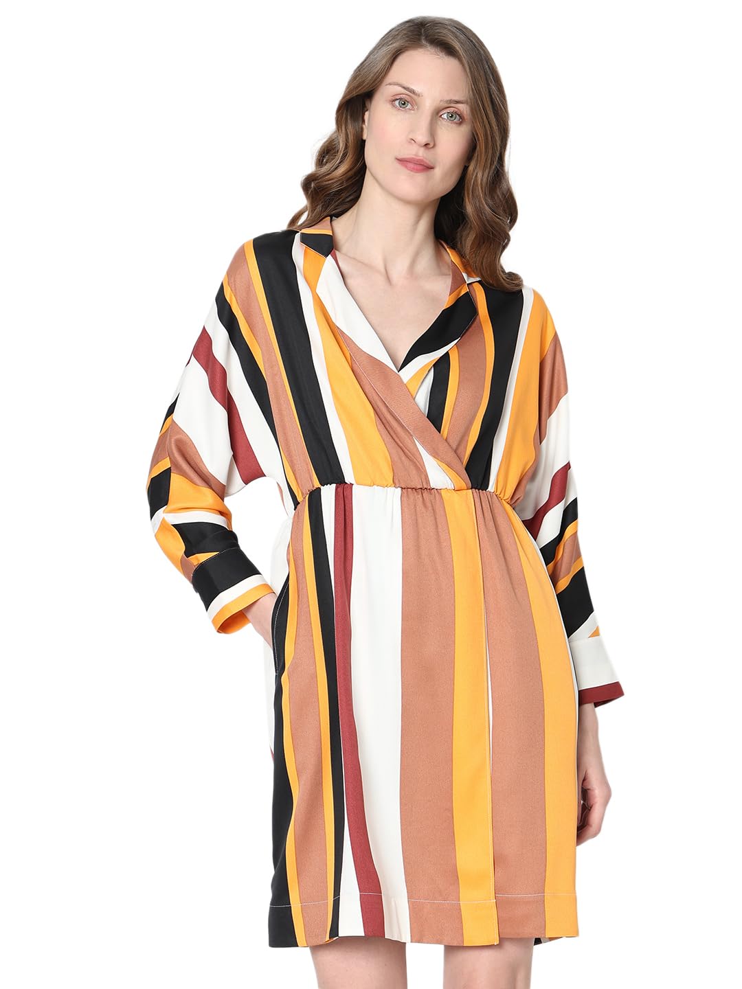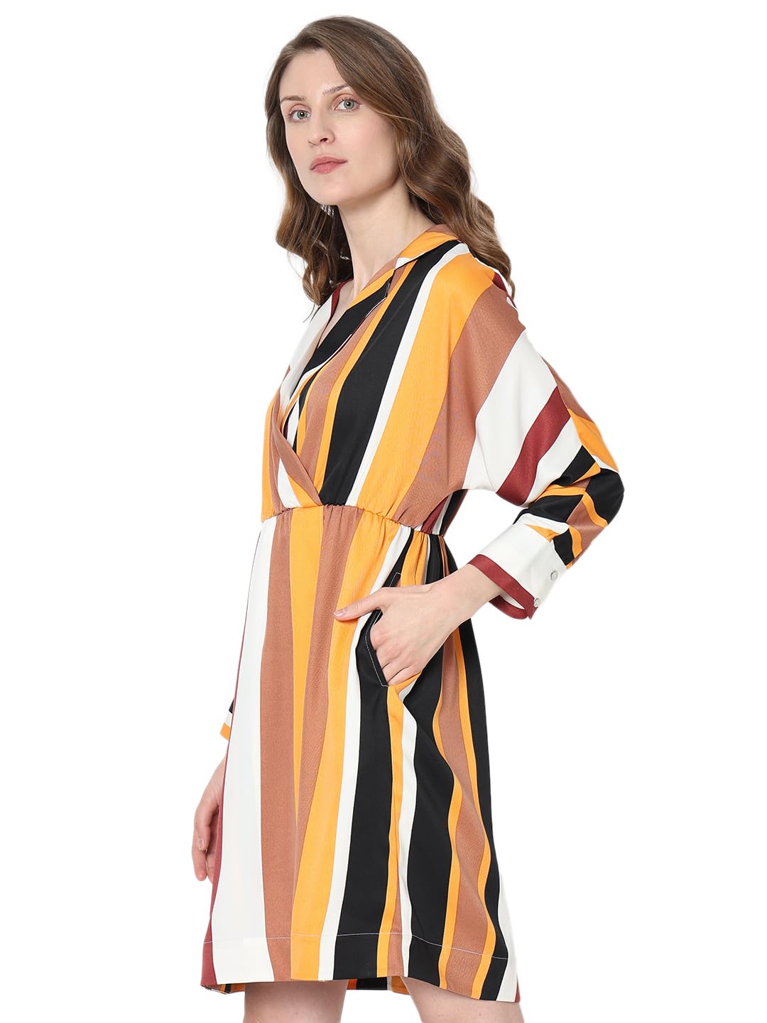 Introducing a chic mock wrap dress for women, featuring a front lapel neckline, flirtatious fit & flare silhouette, and a length that gracefully falls above the knee. Elevate your style with this sophisticated yet playful ensemble. Tip: Pair with nude heels and minimal accessories for a timeless, effortlessly chic look.