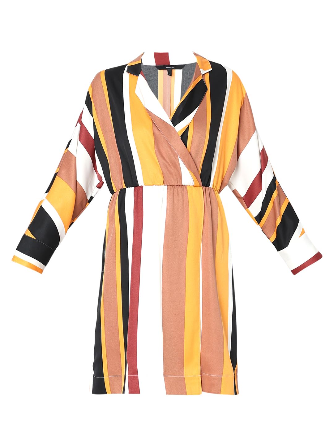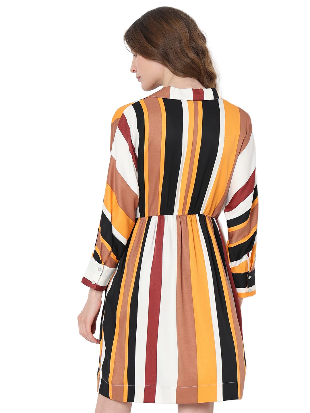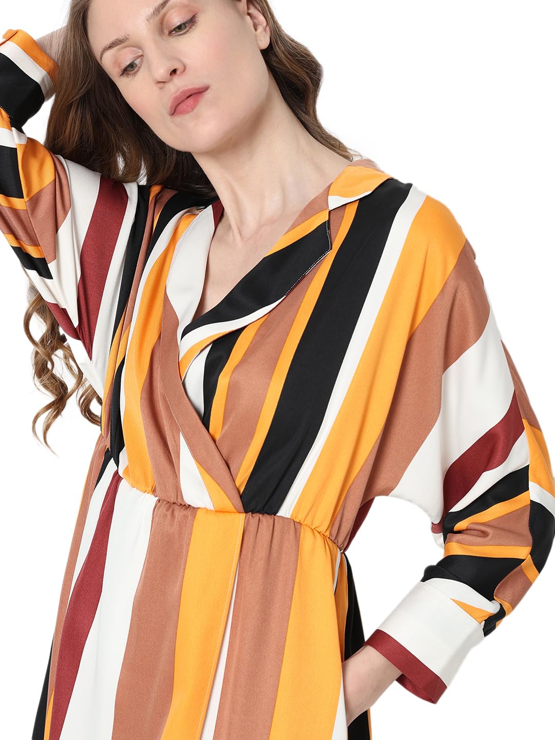 Introducing a chic mock wrap dress for women, featuring a front lapel neckline, flirtatious fit & flare silhouette, and a length that gracefully falls above the knee. Elevate your style with this sophisticated yet playful ensemble. Tip: Pair with nude heels and minimal accessories for a timeless, effortlessly chic look.