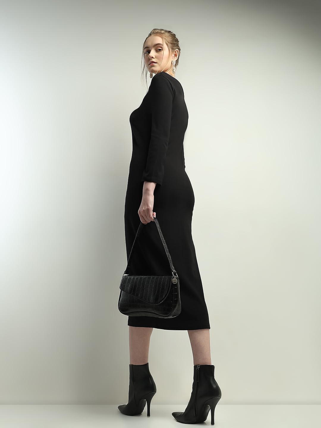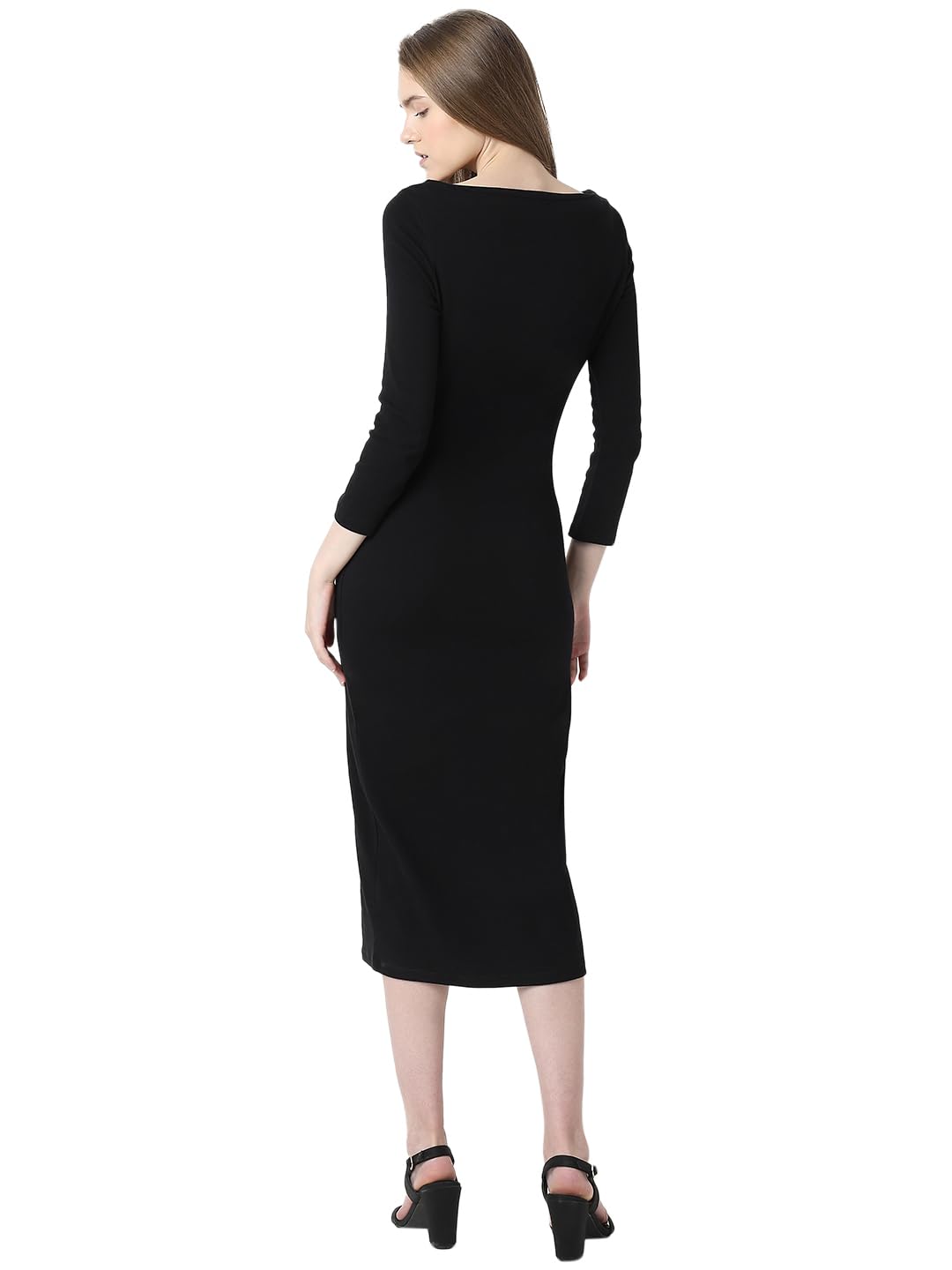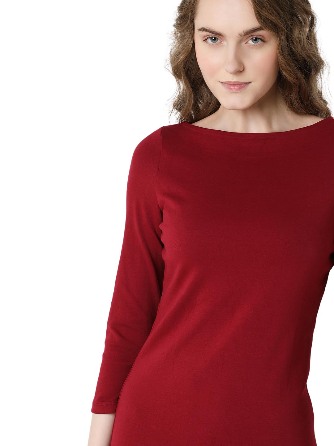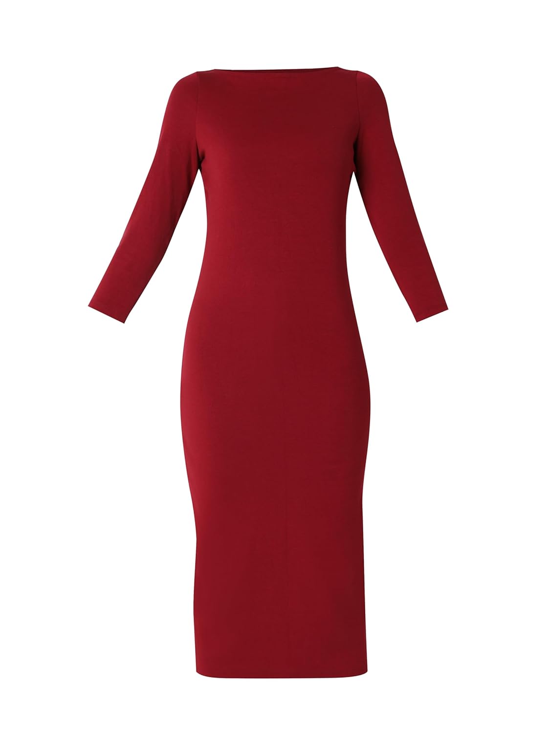 Introducing elegance in every detail, our Solid Red Midi Sheath Dress is a timeless addition to your wardrobe. Crafted with 3/4th sleeves and a graceful boat neck, this dress exudes sophistication effortlessly. Perfect for both formal gatherings and casual chic outings, its solid red hue ensures a versatile piece that stands out with understated charm. Elevate your style with this essential silhouette, tailored to complement every occasion with refined simplicity.