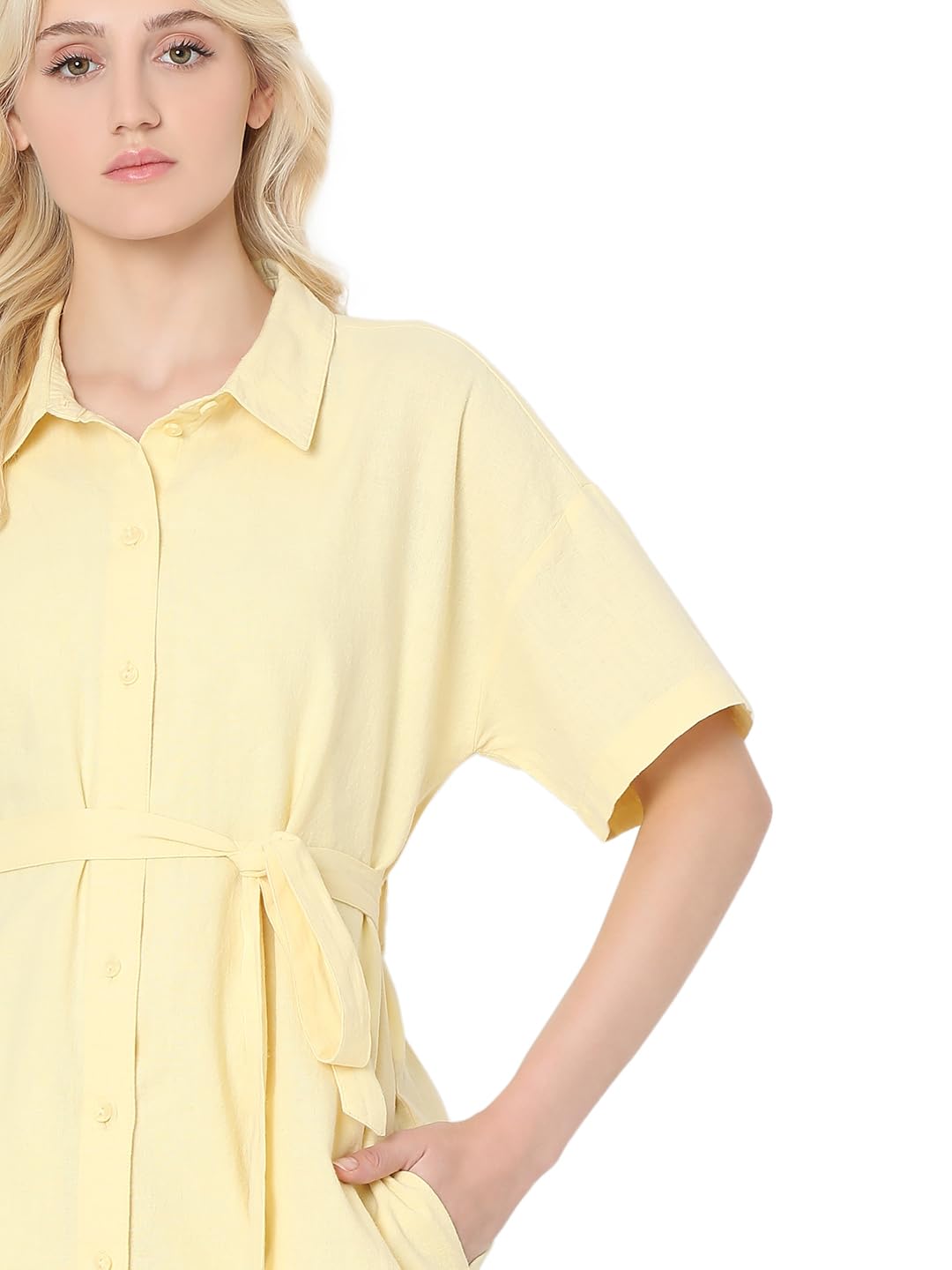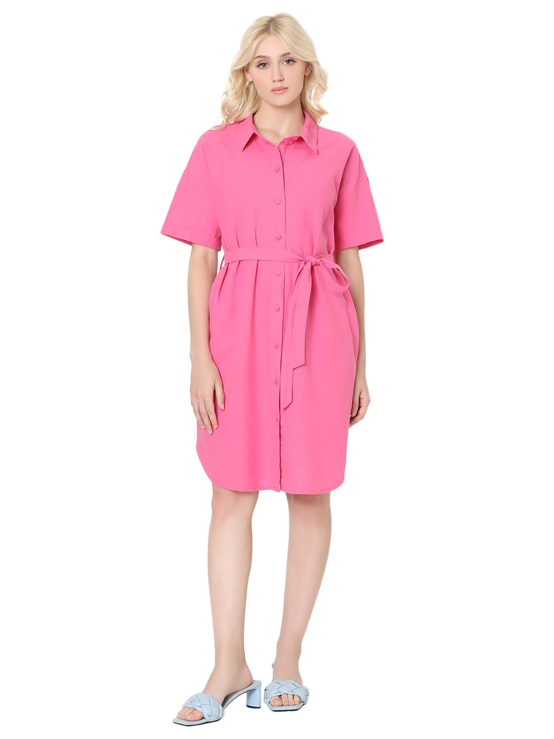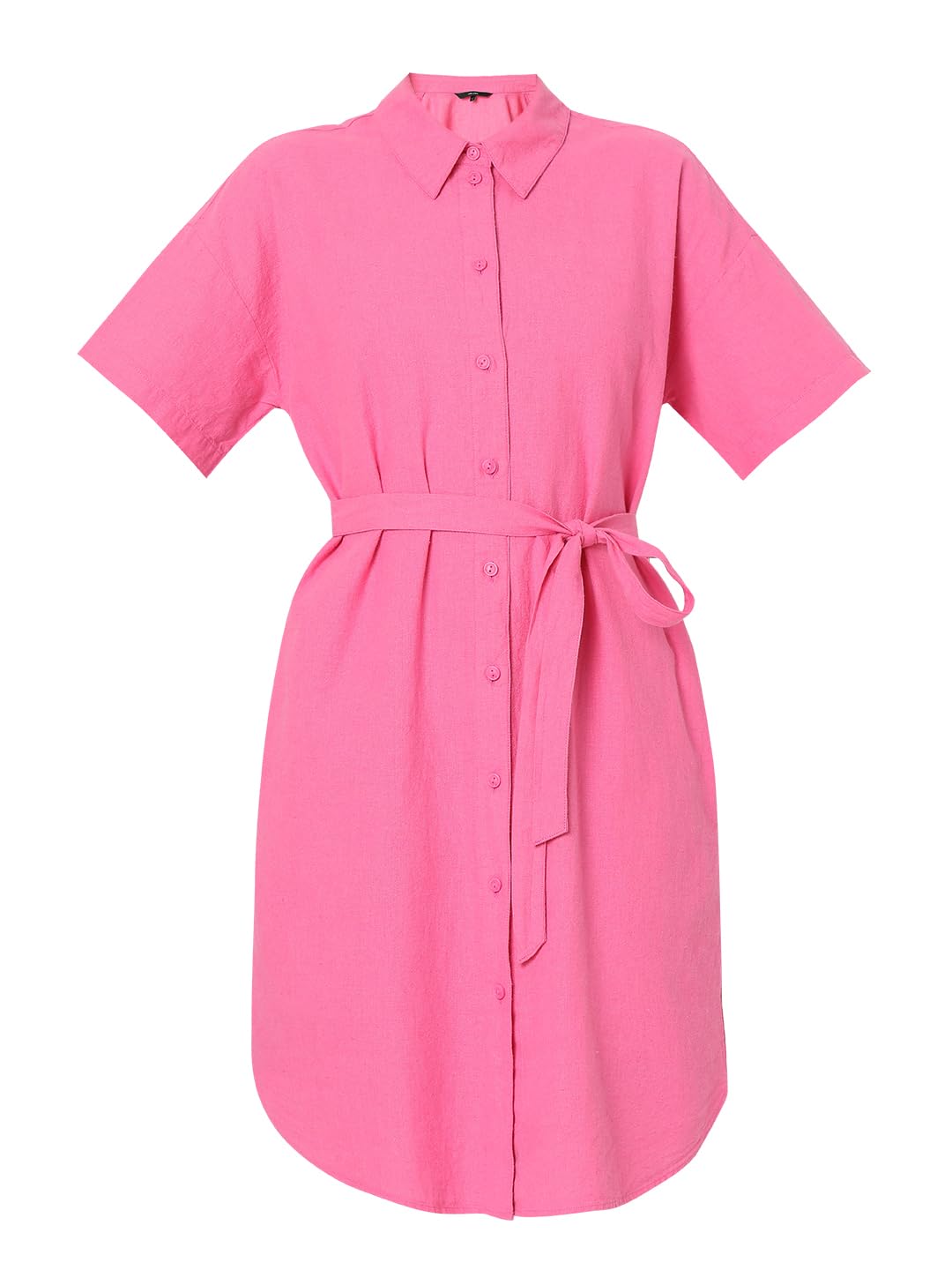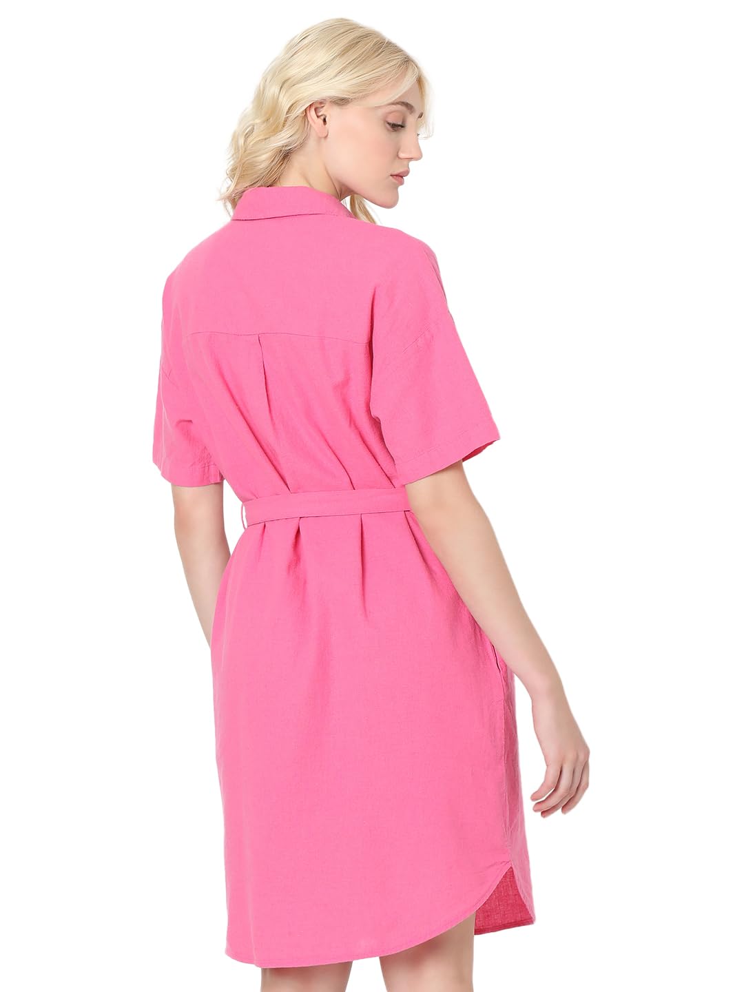 Introducing our Pink Shirt Dress, a timeless blend of sophistication and comfort. Crafted from a luxurious linen-cotton blend, this dress boasts a regular collar and short sleeves, creating an effortlessly chic look. The addition of a tasteful belt at the waist not only accentuates your silhouette but also adds a touch of refinement to your ensemble. Designed with a front button placket for a classic touch, the dress features a gracefully curved bottom hem that falls above the knee, striking the perfect balance between modern style and traditional charm. The exquisite pink hue elevates the dress to a level of understated elegance, making it a versatile piece for both casual and semi-formal occasions. Style Note: Embrace the sophistication of this dress by pairing it with delicate accessories and your favourite heels.