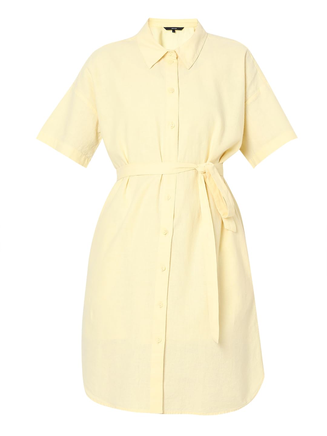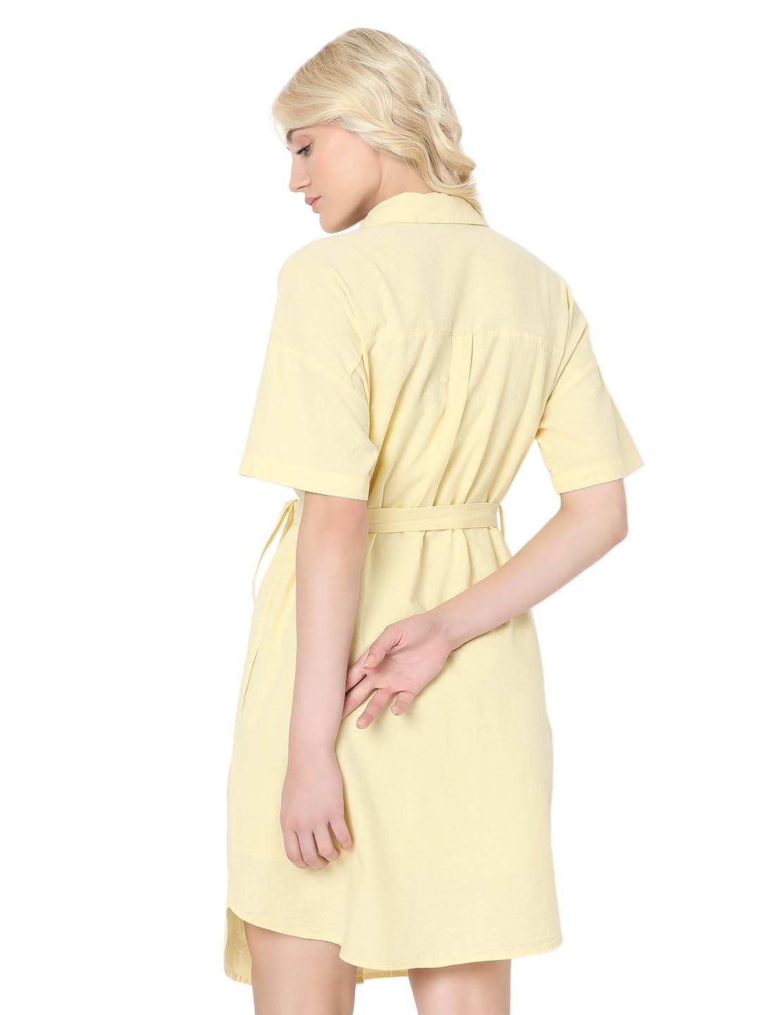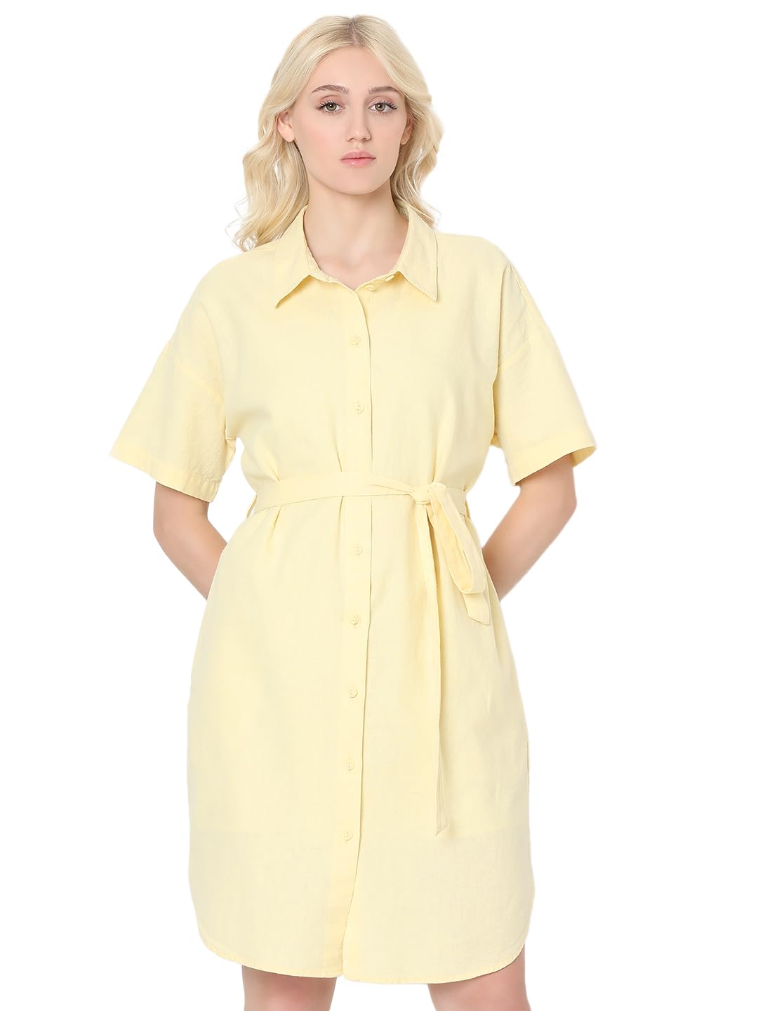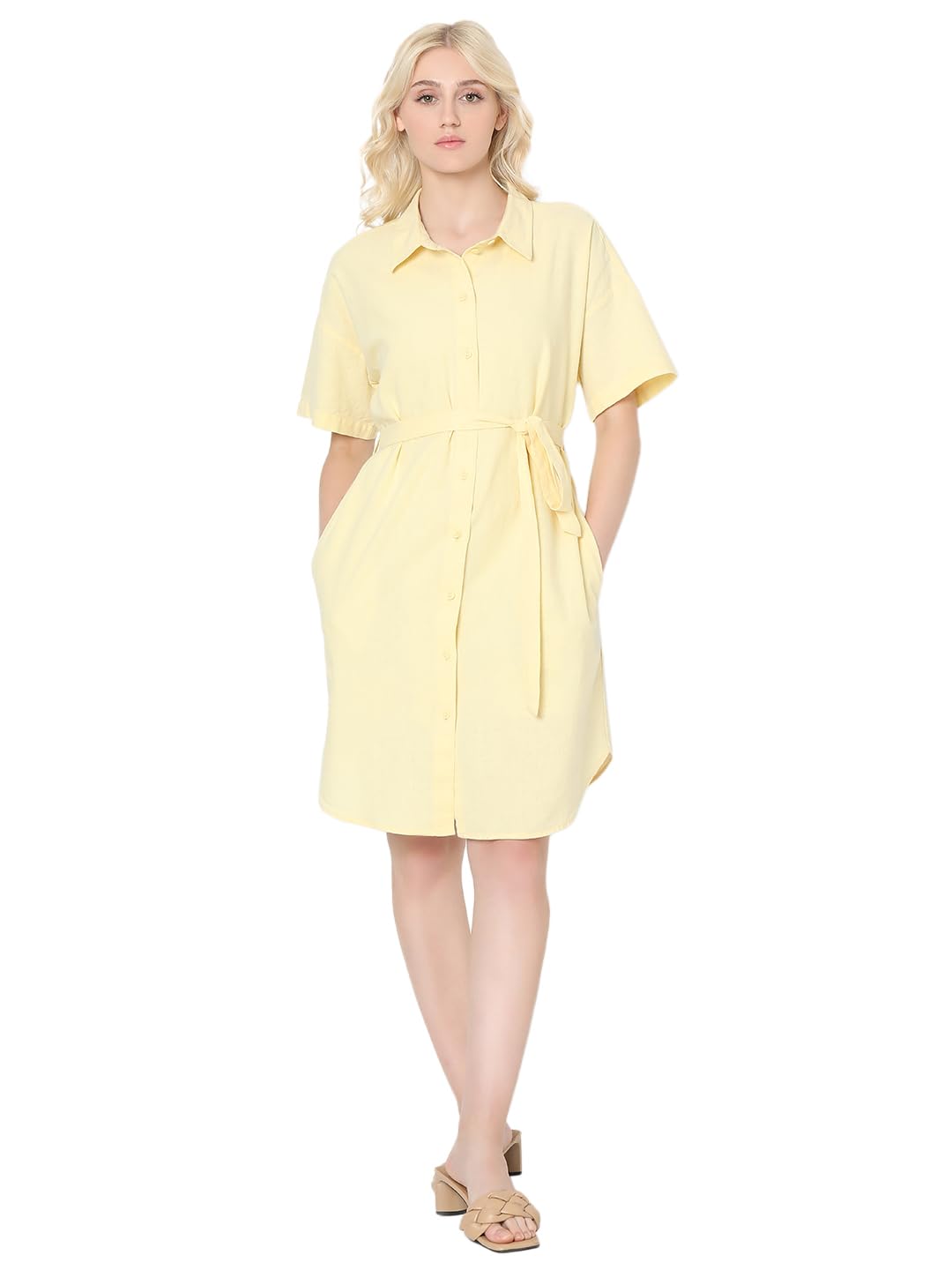 Introducing our Pink Shirt Dress, a timeless blend of sophistication and comfort. Crafted from a luxurious linen-cotton blend, this dress boasts a regular collar and short sleeves, creating an effortlessly chic look. The addition of a tasteful belt at the waist not only accentuates your silhouette but also adds a touch of refinement to your ensemble. Designed with a front button placket for a classic touch, the dress features a gracefully curved bottom hem that falls above the knee, striking the perfect balance between modern style and traditional charm. The exquisite pink hue elevates the dress to a level of understated elegance, making it a versatile piece for both casual and semi-formal occasions. Style Note: Embrace the sophistication of this dress by pairing it with delicate accessories and your favourite heels.