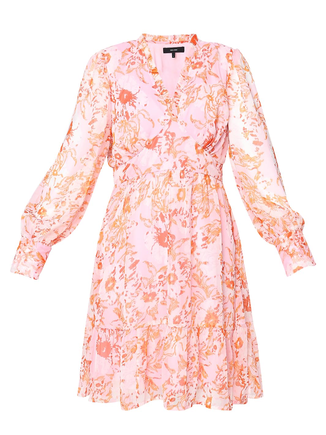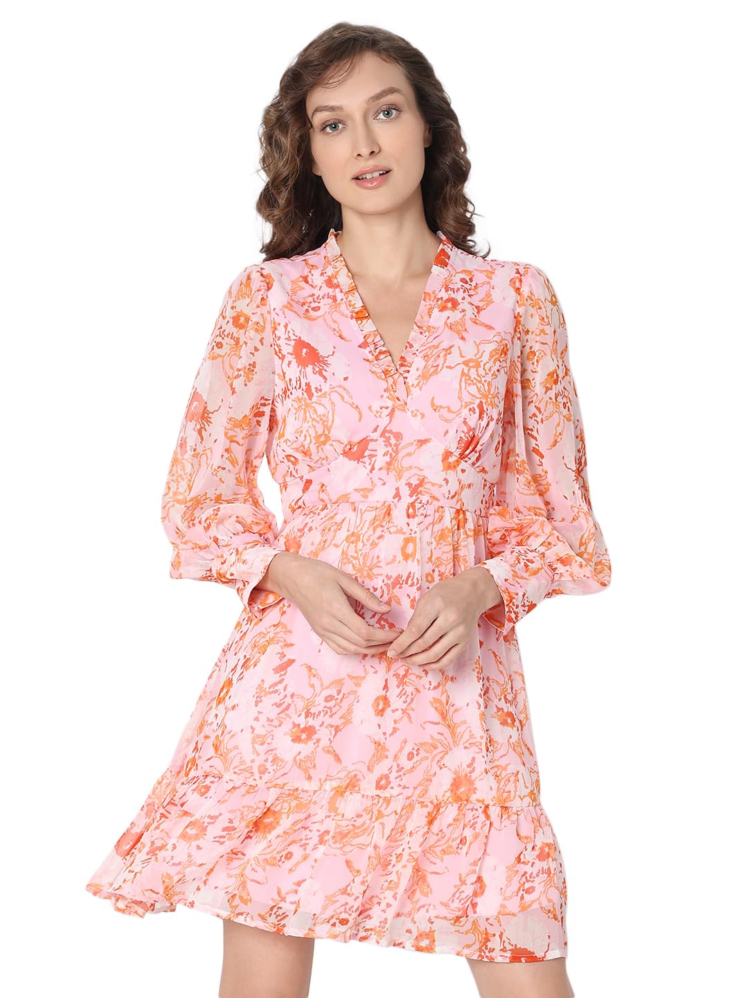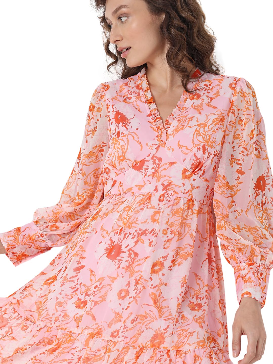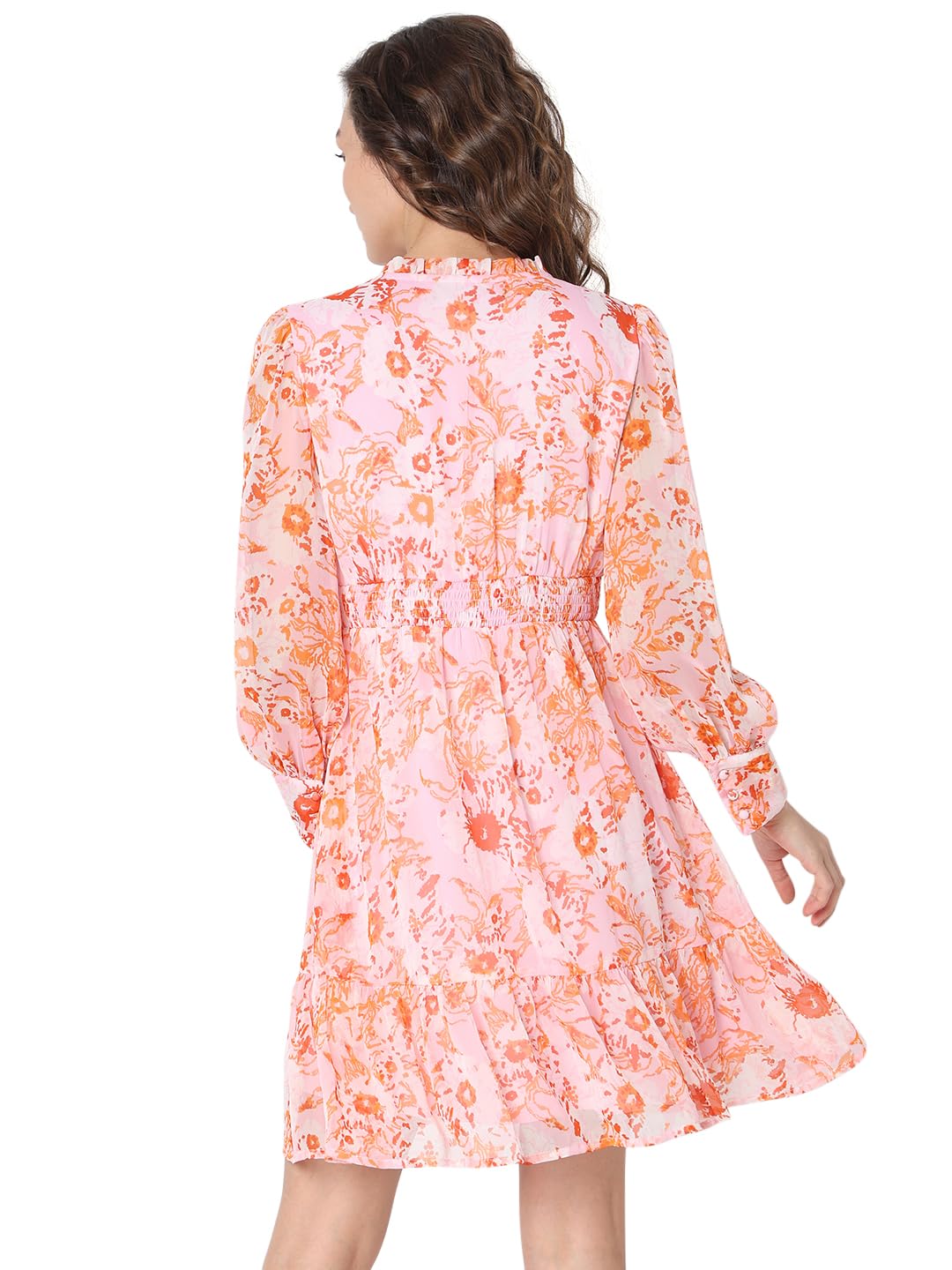 Get ready to turn heads in this vibrant orange all-over printed dress! Embrace the playful fit and flare style with long sleeves featuring cuffs for added charm. The stylish V-neck comes with a delightful ruffle, and the bottom tier detail adds a touch of flair. Falling just above the knees, this dress is a perfect blend of fun and chic. Elevate your wardrobe with a burst of color and enjoy the unique style notes this dress brings to any occasion!
