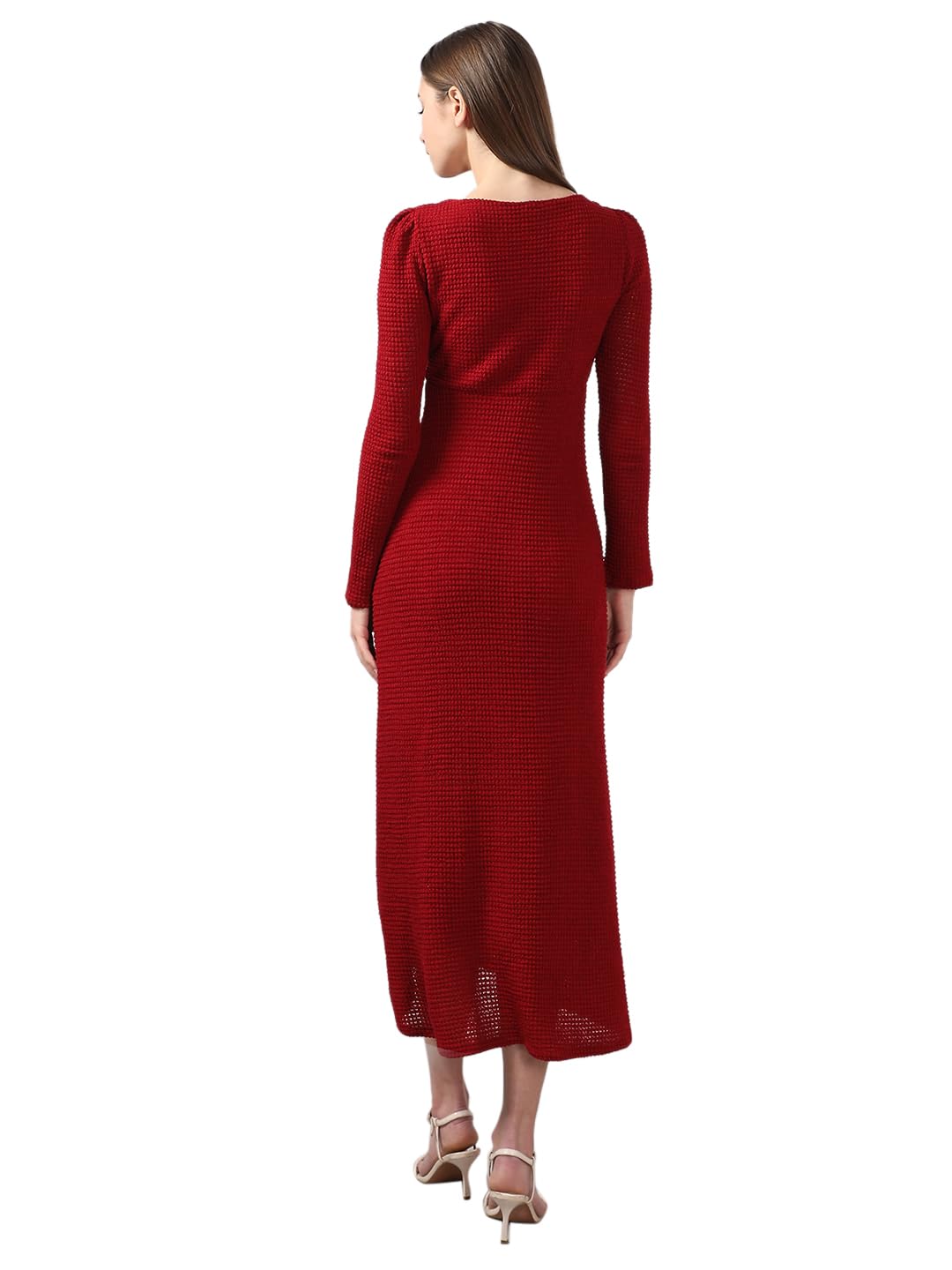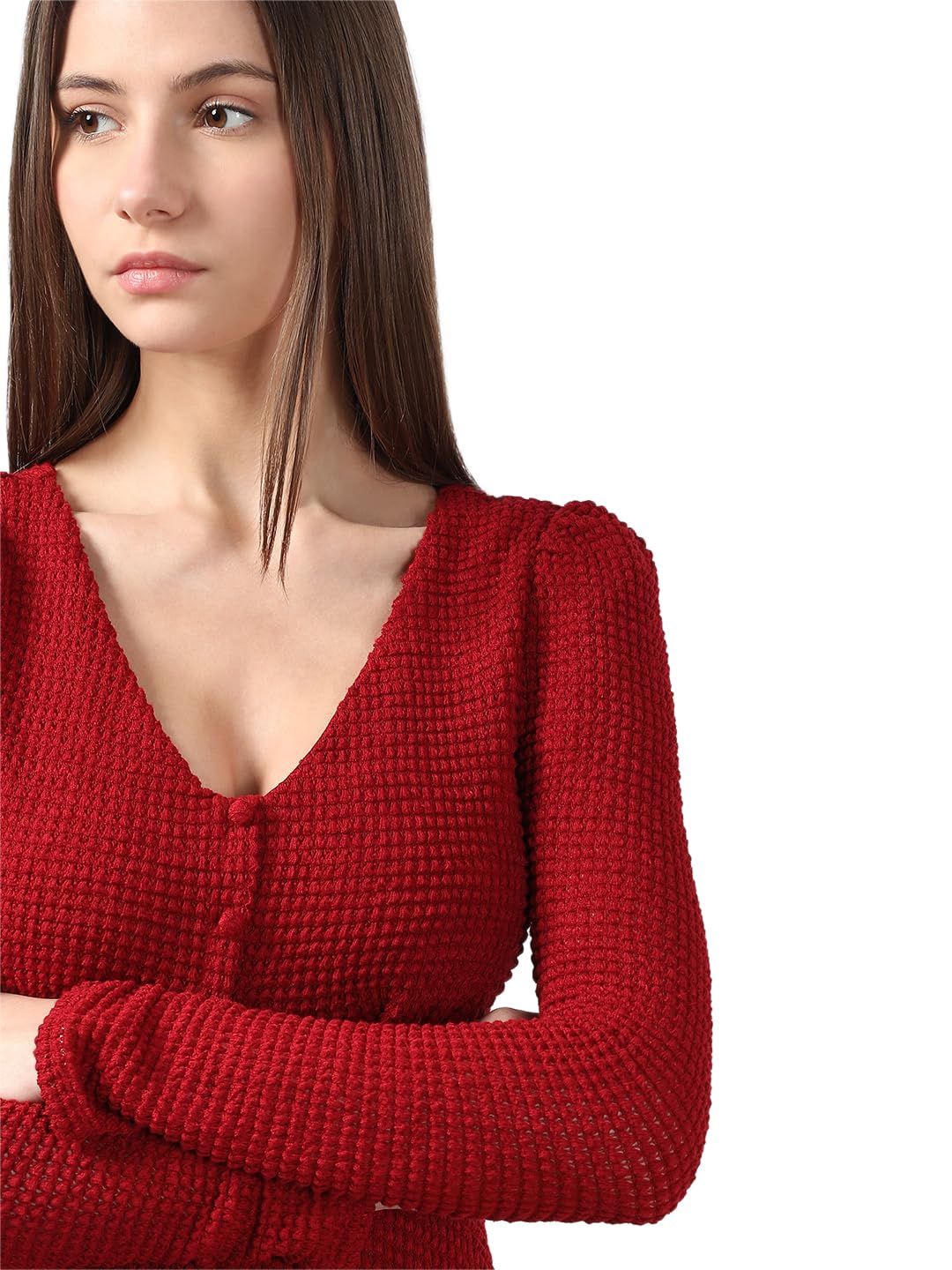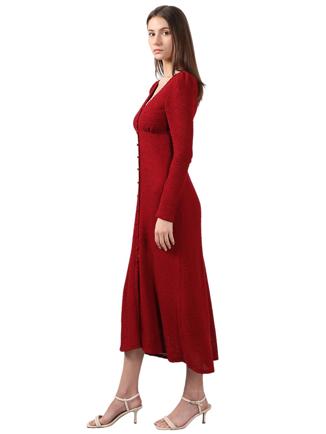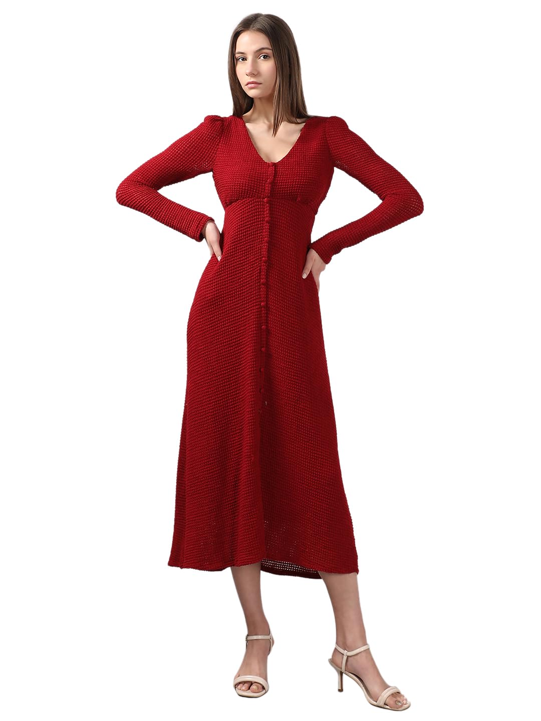 A bold red V-neck maxi dress that combines style and comfort. Featuring button details at the front, long sleeves, and a flattering curved hemline, it offers a straight fit and stretchable fabric for all-day ease. Lined for a smooth finish. Perfect for effortless chic.
