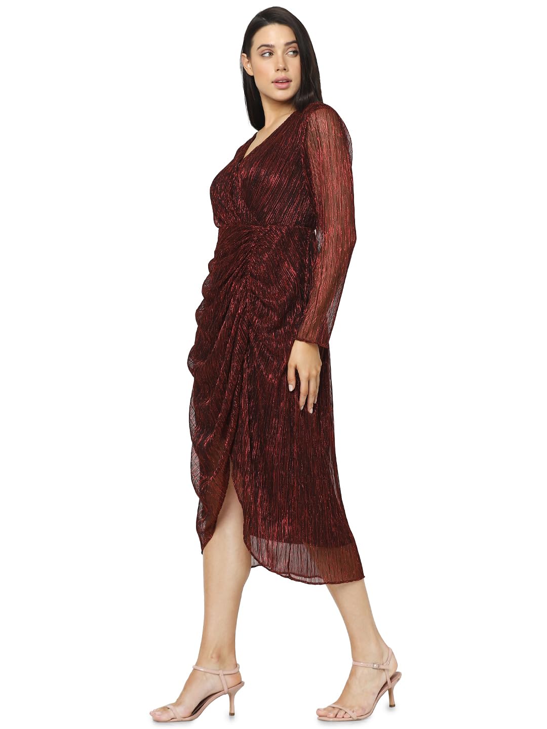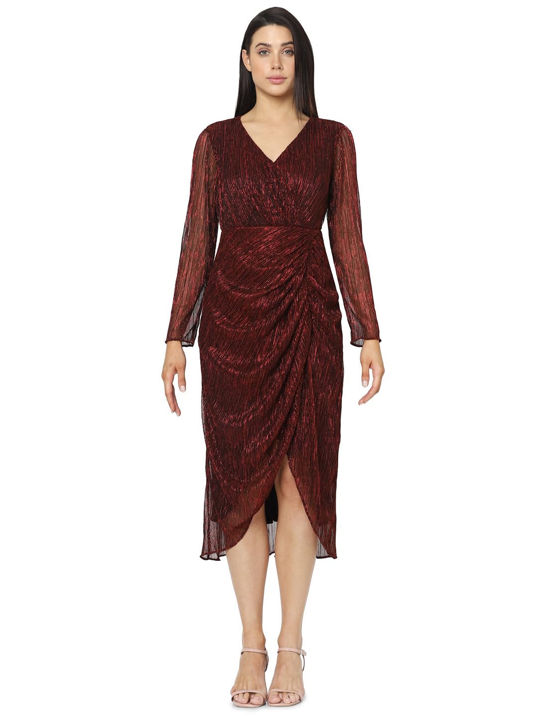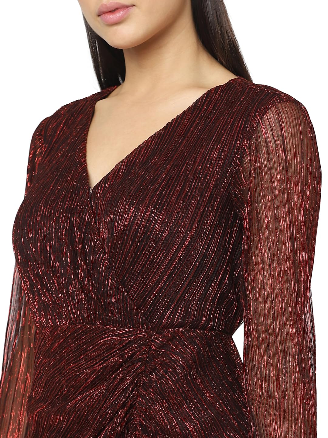This sartorial gem is a resplendent earthy red creation, expertly fashioned from delicate sheer fabric, and embellished with exquisite cascading ruffles that beckon a closer look.