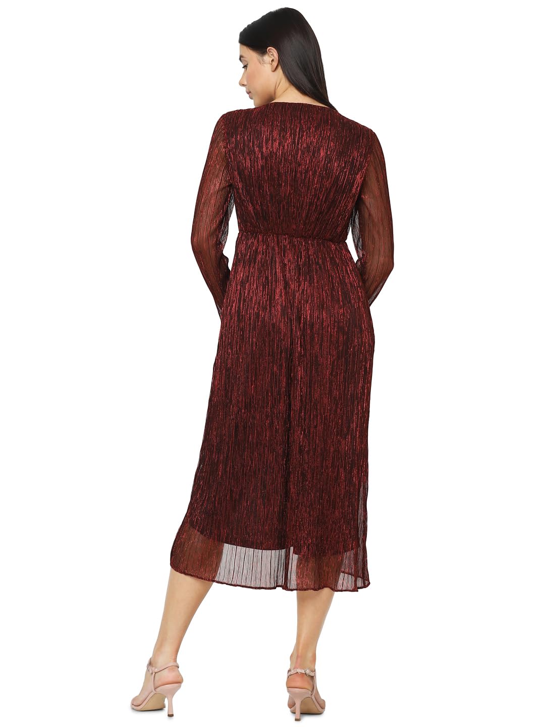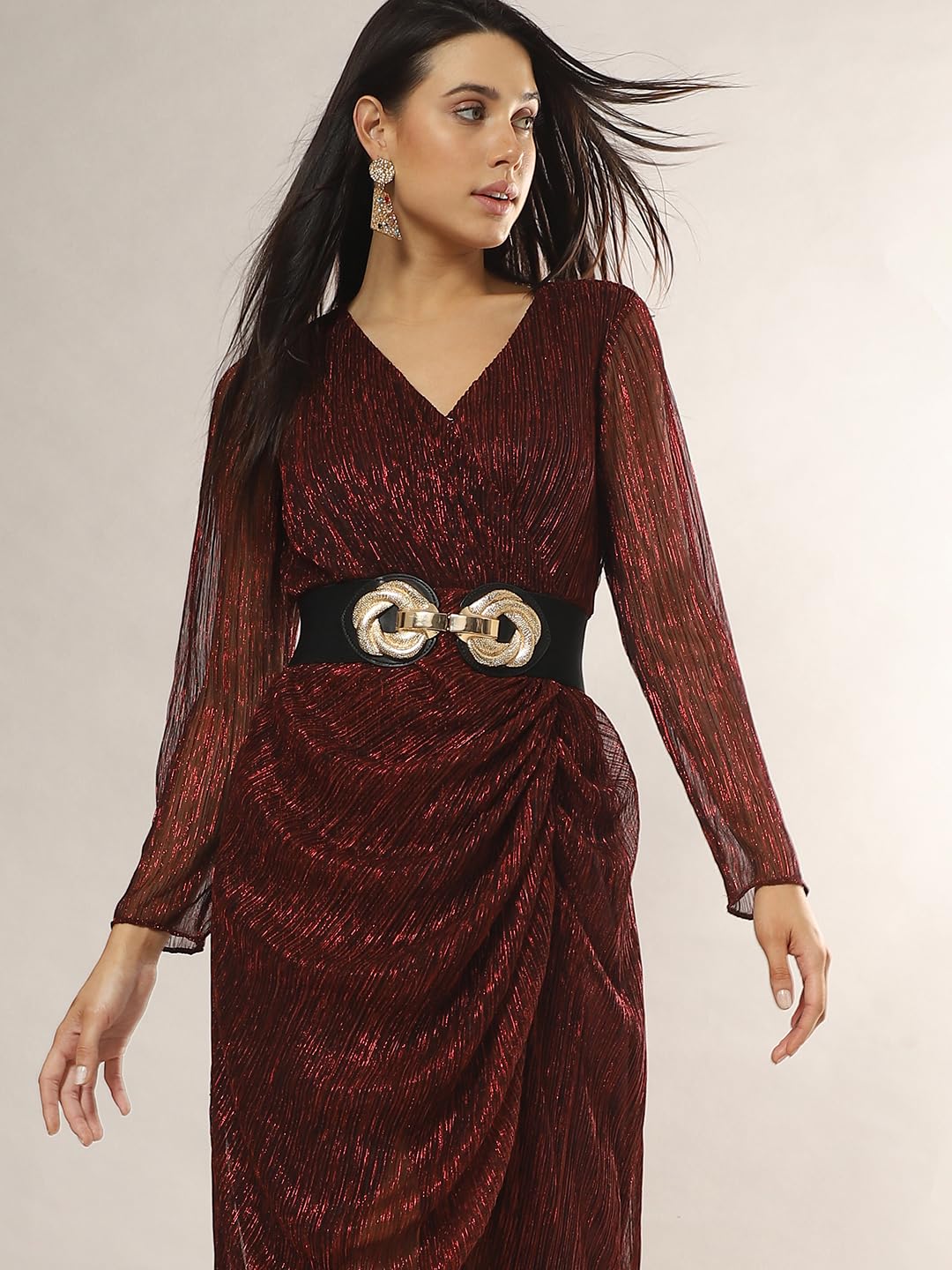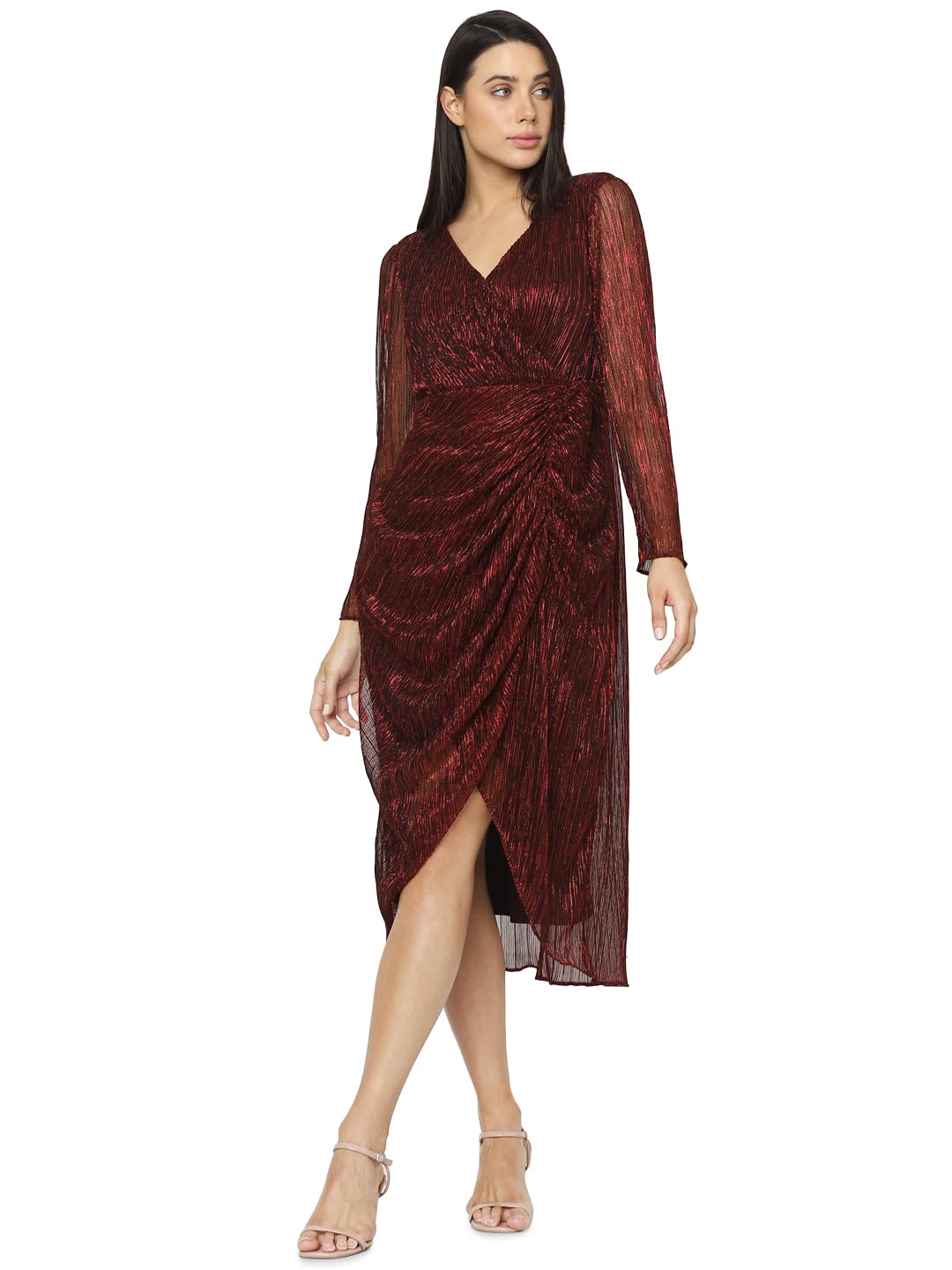 This sartorial gem is a resplendent earthy red creation, expertly fashioned from delicate sheer fabric, and embellished with exquisite cascading ruffles that beckon a closer look.