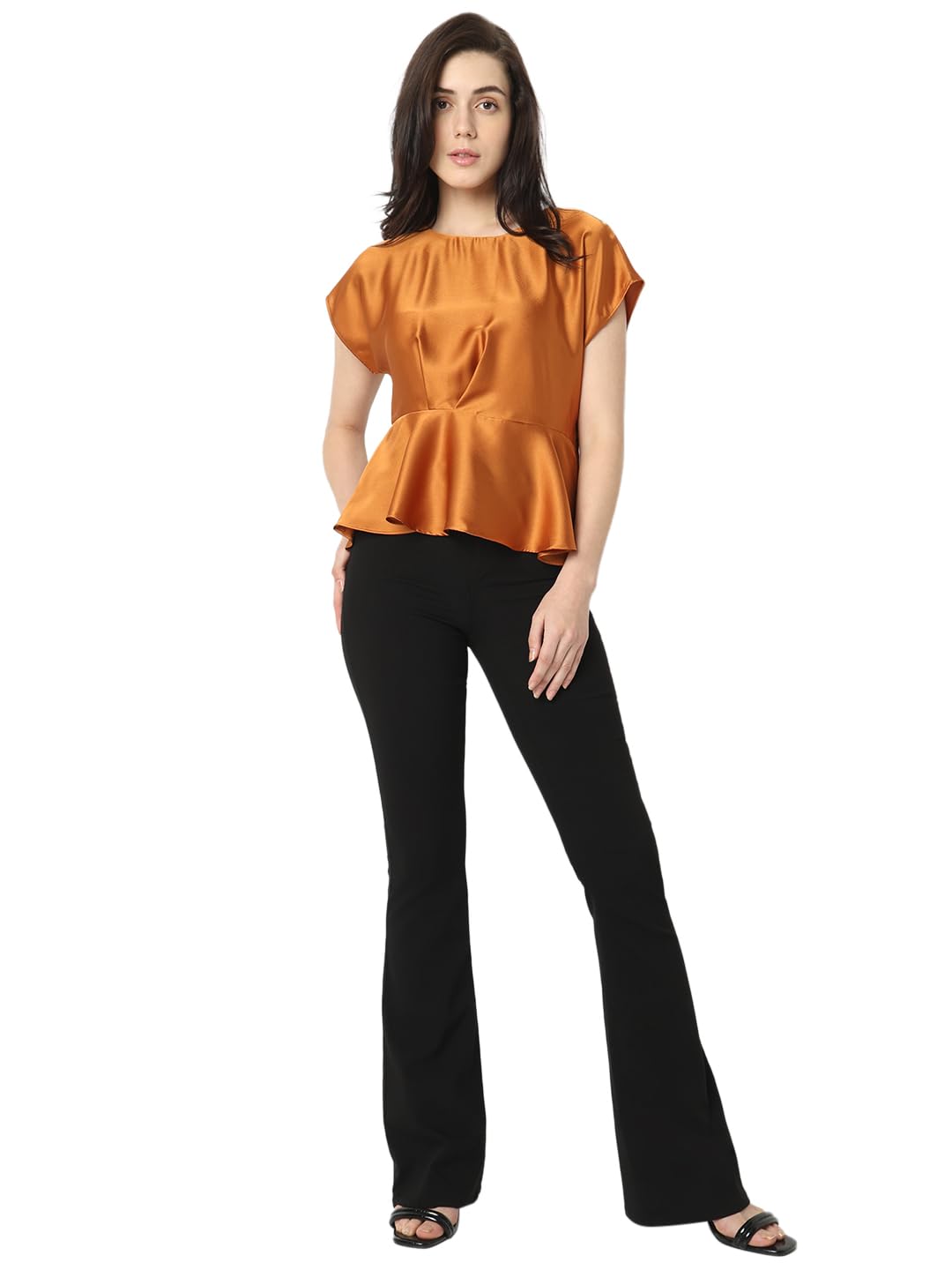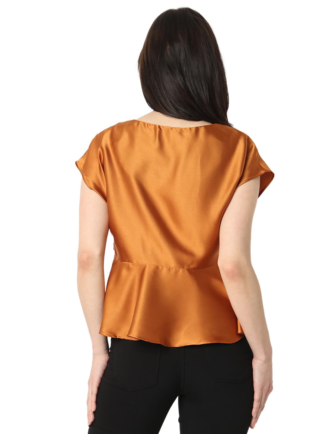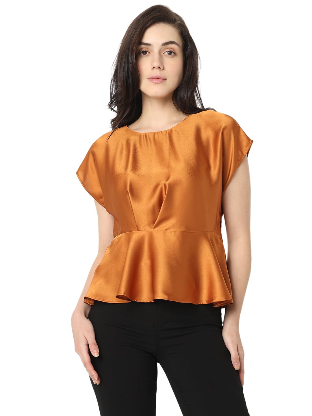 Standout from the rest wearing this chic copper hued top designed in a peplum silhouette with a round neck, solid print, and length that falls at hips.