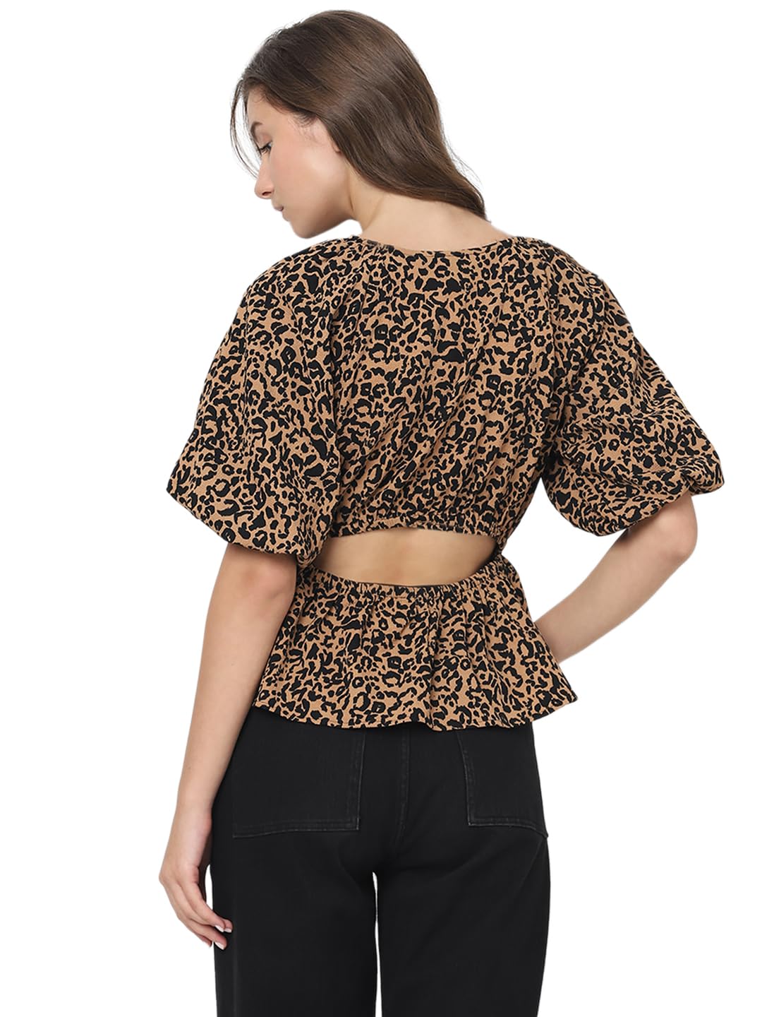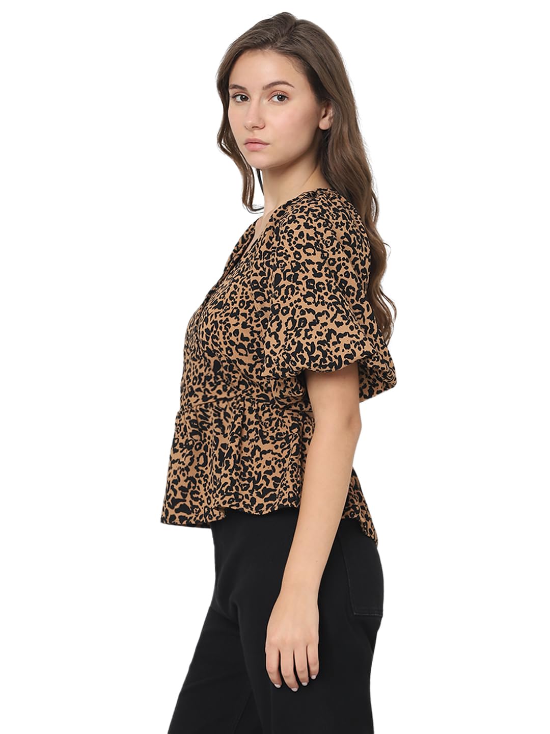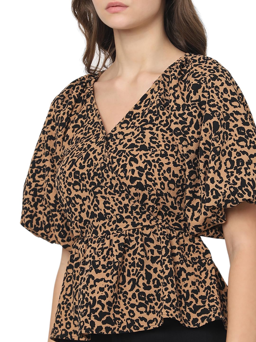 Our sophisticated Peplum Top is a timeless blend of style and grace for the summer season. The V-neckline and mock wrap front accentuate elegance, while the waistband at the waist creates a flattering silhouette. Adorned in a chic cheetah print, this short puff-sleeved beauty seamlessly combines the wild with the refined. A playful peplum hem adds a touch of flair, ensuring you radiate confidence wherever you go. The cut-out detail at the back adds an unexpected allure, making it a perfect choice for those who appreciate a dash of intrigue in their wardrobe.