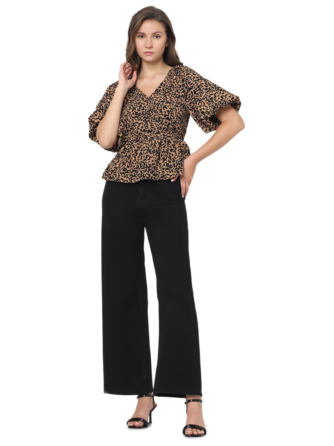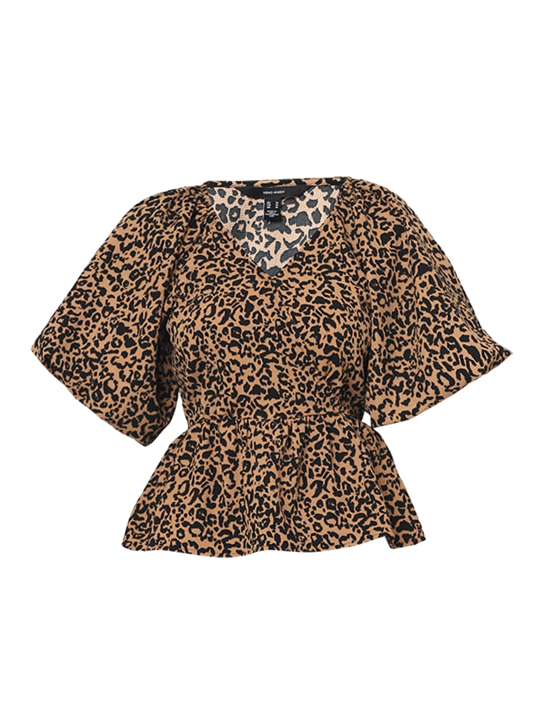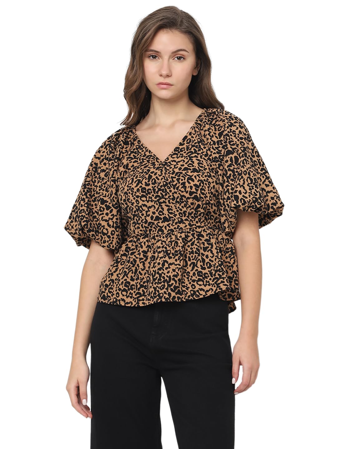 Our sophisticated Peplum Top is a timeless blend of style and grace for the summer season. The V-neckline and mock wrap front accentuate elegance, while the waistband at the waist creates a flattering silhouette. Adorned in a chic cheetah print, this short puff-sleeved beauty seamlessly combines the wild with the refined. A playful peplum hem adds a touch of flair, ensuring you radiate confidence wherever you go. The cut-out detail at the back adds an unexpected allure, making it a perfect choice for those who appreciate a dash of intrigue in their wardrobe.