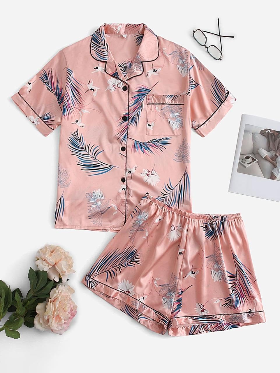 - 🌙 Stylish & Elegant Design: Features a classic button-down short sleeve shirt with a notched collar and a chest pocket, paired with matching satin shorts.